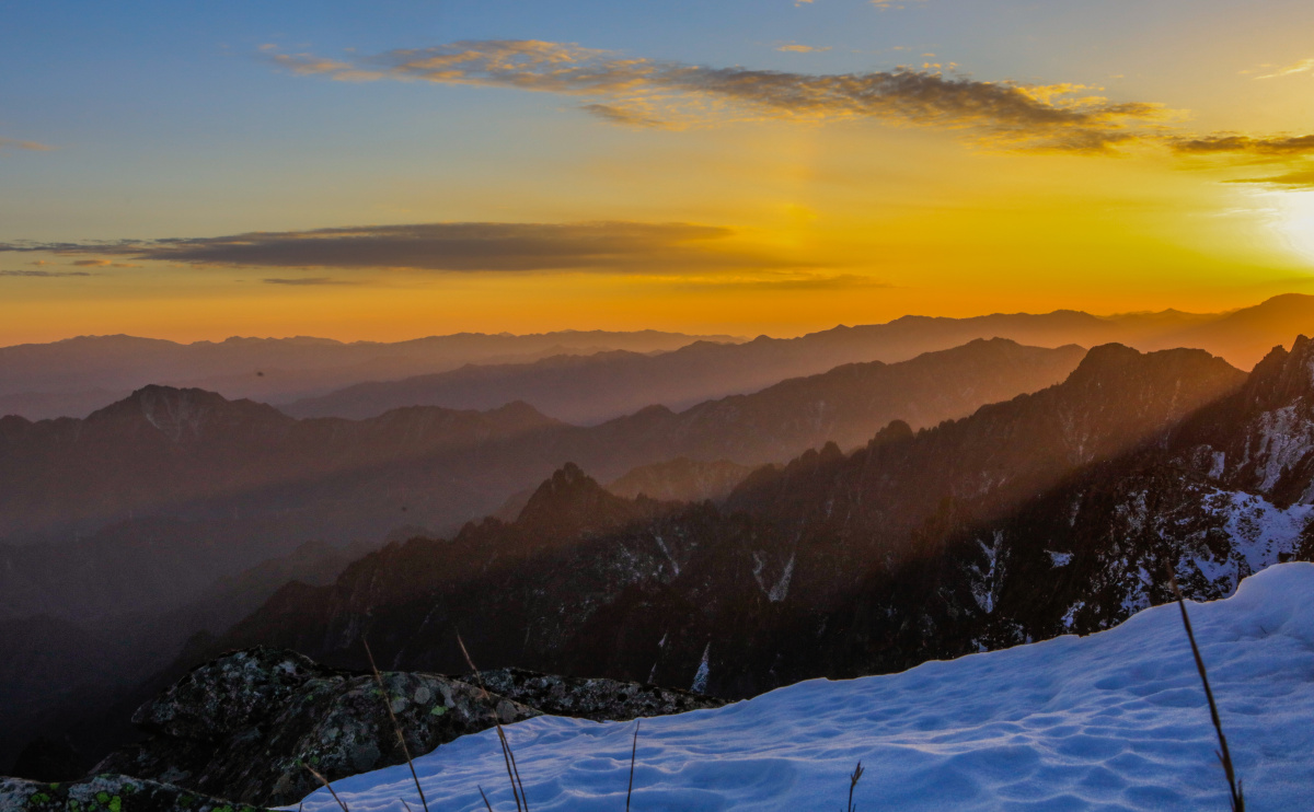 秦岭夕照,层峦鎏金:夕阳穿透雾霭,在山峦间勾勒出明暗交织的轮廓,将雄浑的山景晕染得如诗如画,尽显秦岭的巍峨大气与自然光影的瑰丽交响。