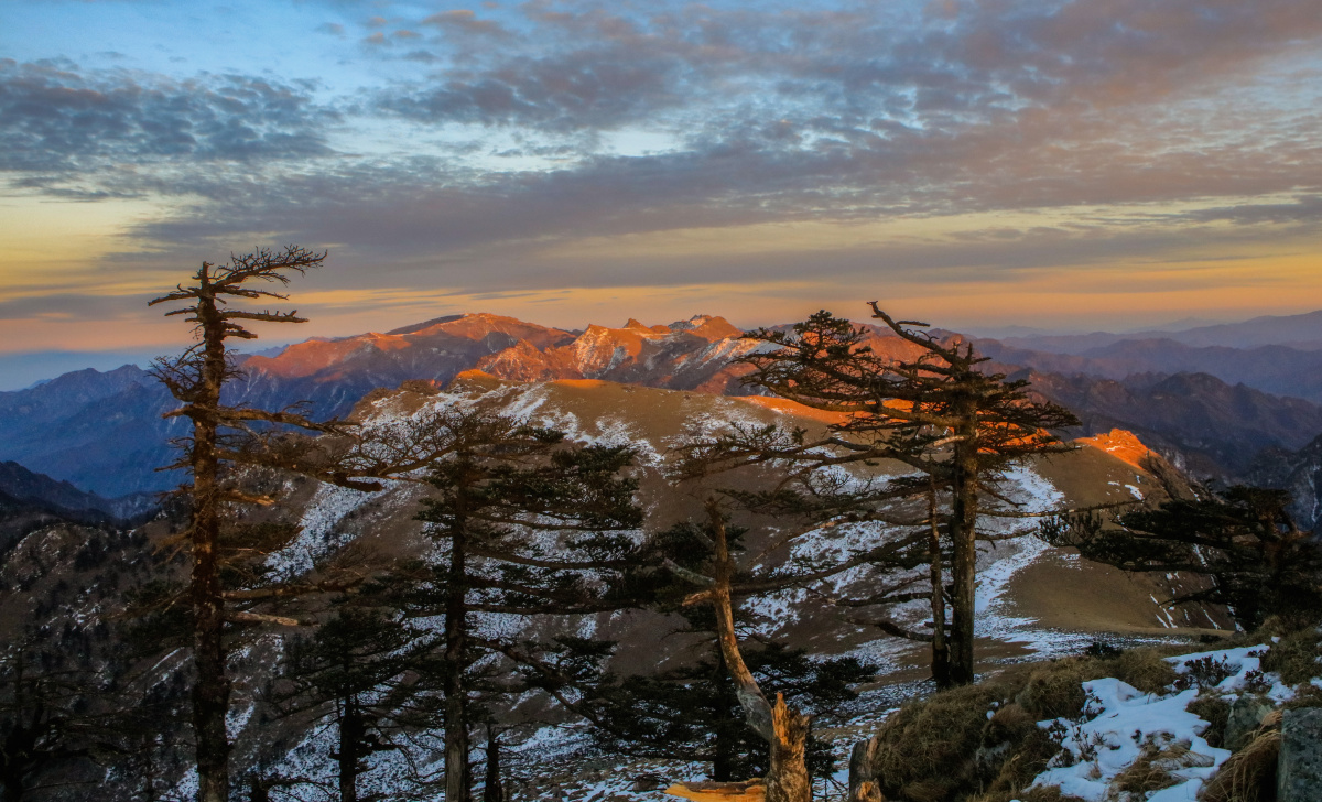 秦岭镀金时刻:随着落日逐渐没入山后,秦岭由低到高,由白而黄而赤,逐渐镀上一层金色。美艳梦幻。