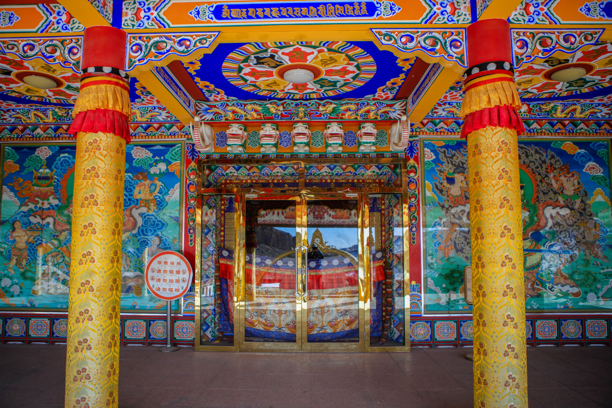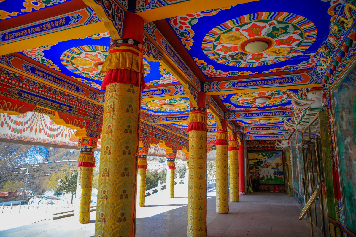 贺兰山广宗寺大佛殿门廊:雕梁画栋,金碧辉煌。